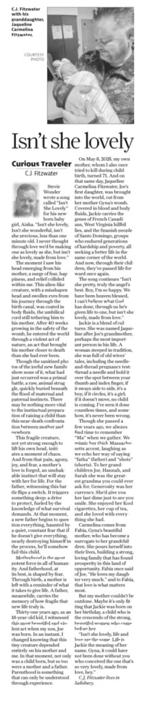 On May 8, 2025, my own mother, whom I also once tried to kill during childbirth, turned 71. And on that same day, Jaqueline Carmelina Fitzwater, Joe’s first daughter, was brought into the world, cut from her mother Gyna’s womb. Covered in blood and body fluids, Jackie carries the genes of French Canadians, West Virginia hillbillies, and the Spanish people of Santo Domingo, groups who endured generations of hardship and poverty, all seeking a better life in the same corner of the world. And now, through their children, they’ve passed life forward once again.