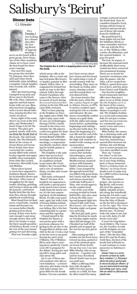 On a Tuesday, I was looking for a dinner date after the Zoning Board of Appeals meeting. I serve on the board with a great group. Drew Dana, one of the other members, claims we’ve been voted the best board for three years running.