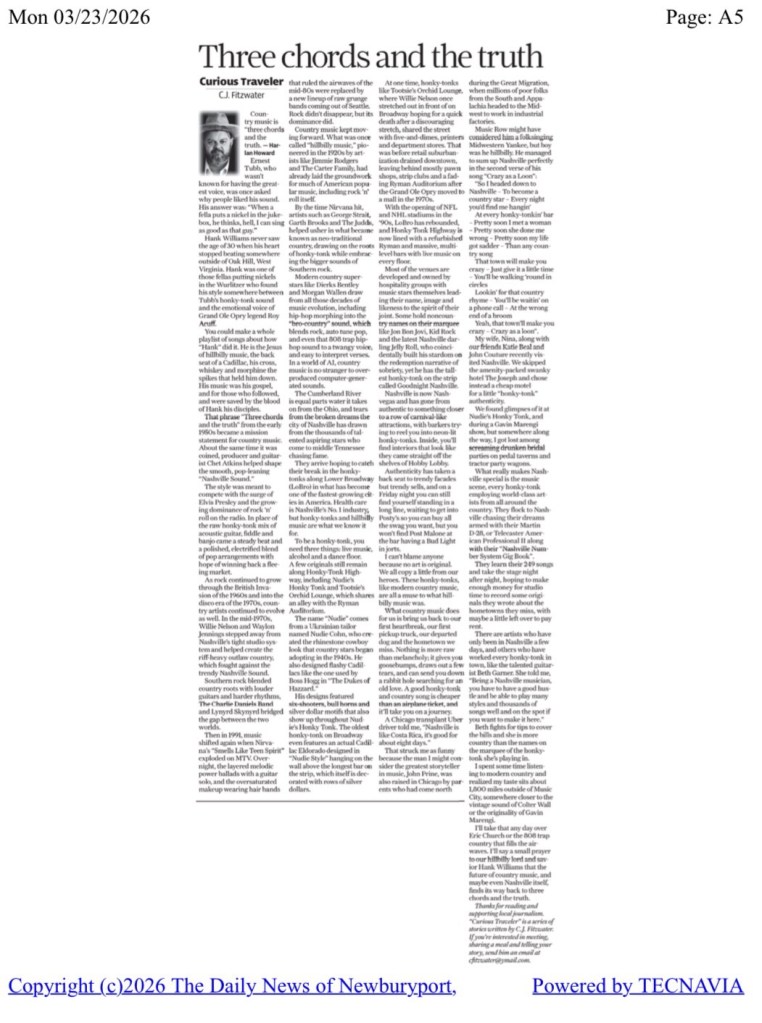 I’ll take that any day over Eric Church or the 808 trap country that fills the airwaves. I’ll say a small prayer to our hillbilly lord and savior Hank Williams that the future of country music, and maybe even Nashville itself, finds its way back to three chords and the truth.