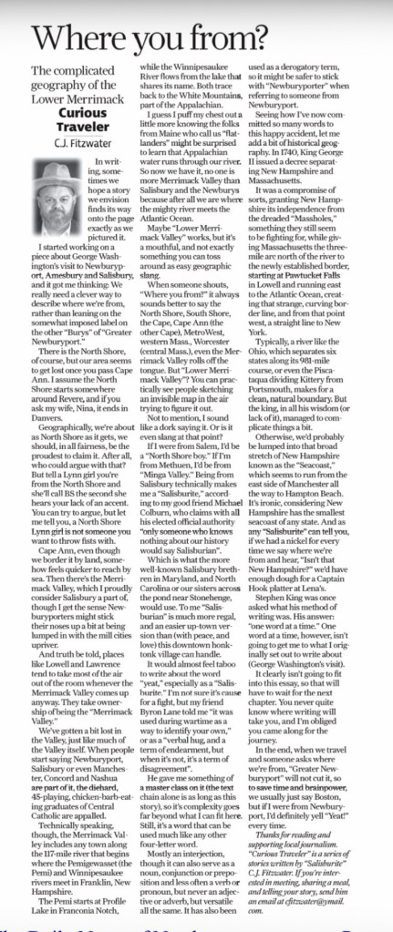 Cape Ann, even though we border it by land, somehow feels quicker to reach by sea. Then there’s the Merrimack Valley, which I proudly consider Salisbury a part of, though I get the sense Newburyporters might stick their noses up a bit at being lumped in with the mill cities upriver.